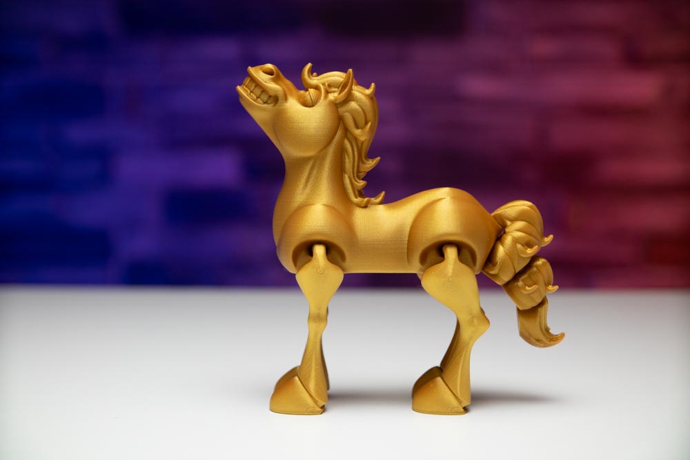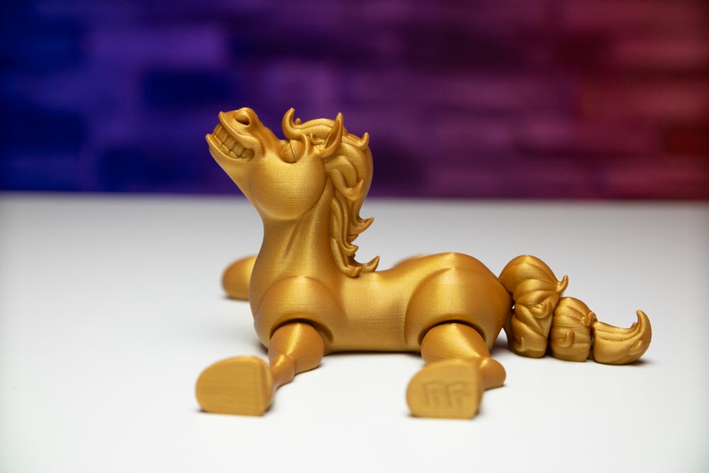 In printing the Articulated Flexi Horse, we have utilized the most modern 3D printers, ensuring precise processing of each detail. The high quality of the used golden filament ensures long-lasting durability and aesthetic value, while the layer height of 0.16mm brings fine and detailed execution.