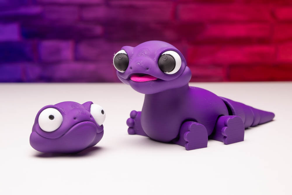 The 3D Printed Articulated Multicolor Cute Lizard stands out for its exquisite detail and lifelike articulation. Crafted with a layer height of 0.16 mm, the model showcases a smooth, segmented body, adorable facial features, and playful expressions with incredible clarity. The bright purple or yellow body, accented by cheerful eyes and a playful pink tongue, adds a captivating depth to the model, enhancing its visual appeal and realism. This attention to detail makes the 3D Printed cute Lizard a true standout in any collection.