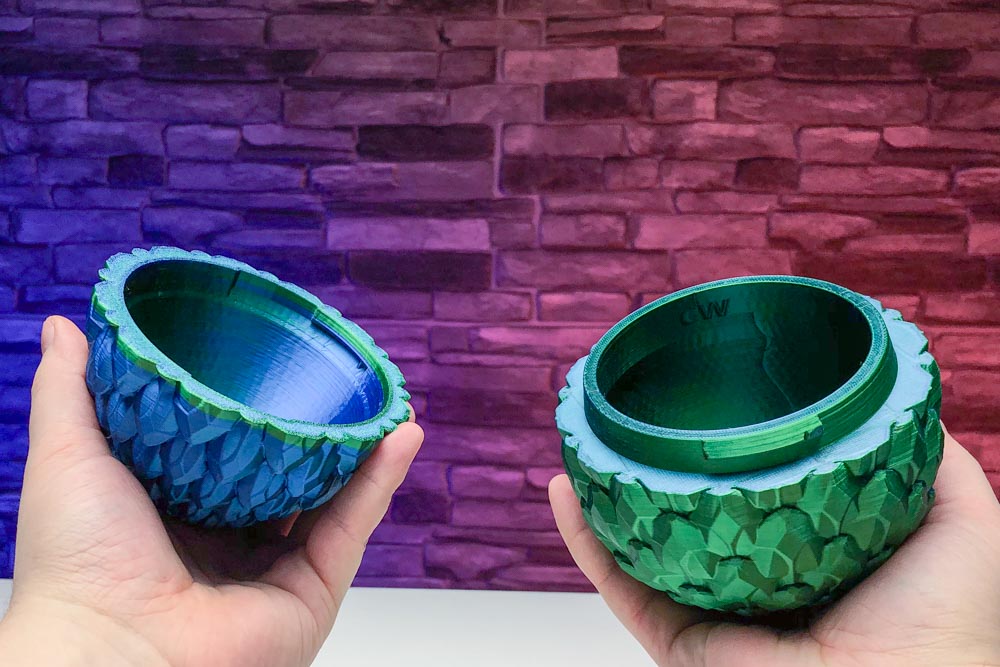 Designed for easy printing on any 3D printer, this model can be printed in two parts, which then simply snap together. The blue-green color is chosen to best convey the beauty and mystery of the item. During two-color filament printing, you may encounter the same issue we did. If the filament twists during printing, you might see a color transition on the egg, as seen on ours, with a few green streaks on the blue part and vice versa. This is not a flaw in the STL model of the 3D Print Dragon Egg but rather due to the filament winding or its insertion into the 3D printer.