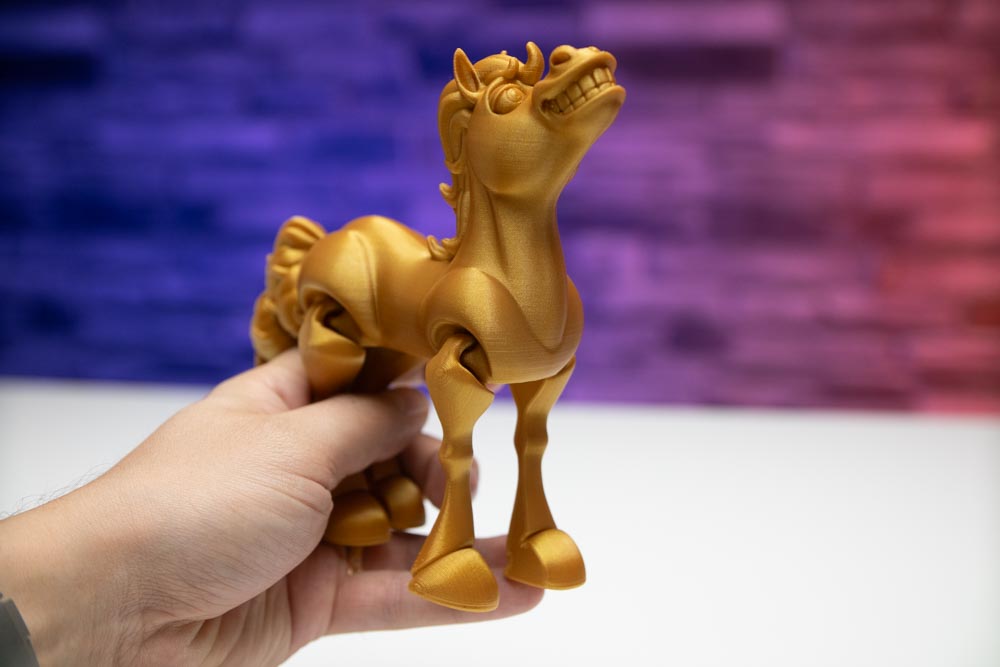 In printing the Articulated Flexi Horse, we have utilized the most modern 3D printers, ensuring precise processing of each detail. The high quality of the used golden filament ensures long-lasting durability and aesthetic value, while the layer height of 0.16mm brings fine and detailed execution.