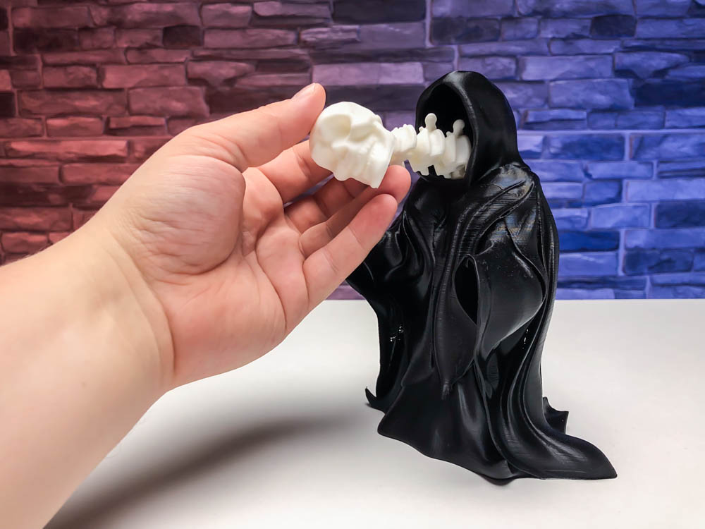 The 3D Printed Death Ghost is a marvel of design and engineering, standing out with its hauntingly detailed skull and lifelike articulated spine. 3D Print with a layer height of 0.xx mm, every aspect of the skulls anatomy and the spines eerie flexibility is captured with stunning clarity. The contrasting colors of the white skull and spine against the black robe create a visual spectacle thats both terrifying and captivating, embodying the essence of a ghostly apparition.
